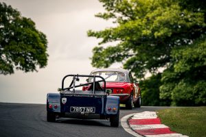 Over the first lap and a half of race 2 Frazer was watching his mirrors closely as the Lotus 7 of Jonathan Stringer loomed steadily larger until suddenly retiring to the paddock with a suspected head gasket failure, leaving Frazer to put on a ‘strictly’ display of car control, dancing his nimble Lotus through the Hall Bends on repeat.